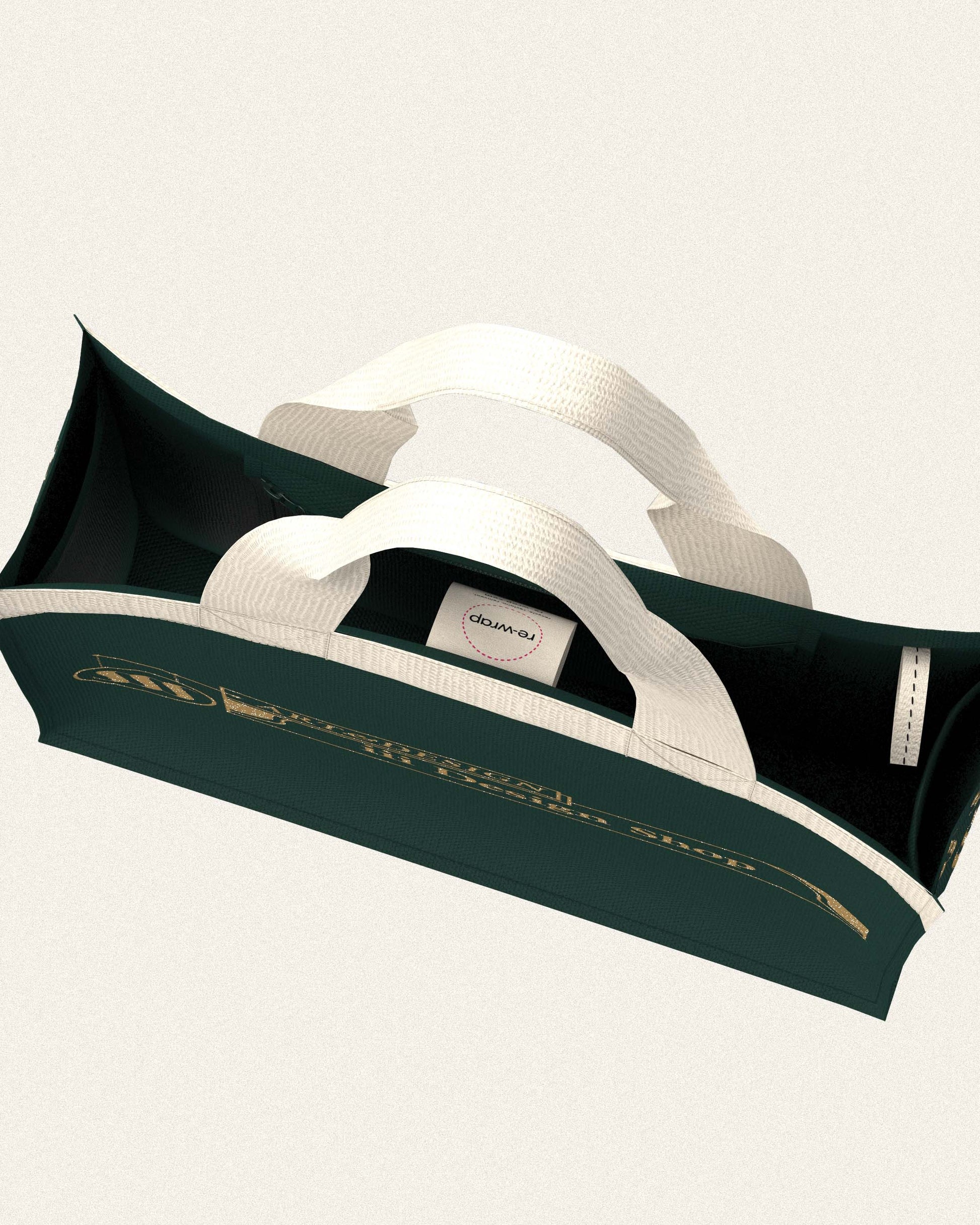 re-wrapというバッグ工場とコラボレーションした今回の商品。re-wrapはDaunt BooksやBritish Libraryなどイギリスの多くの企業に愛された工場の一つで、人と自然のつながりを意識し、糸の製造からバッグの仕上がりまでを一つの会社で行っています。